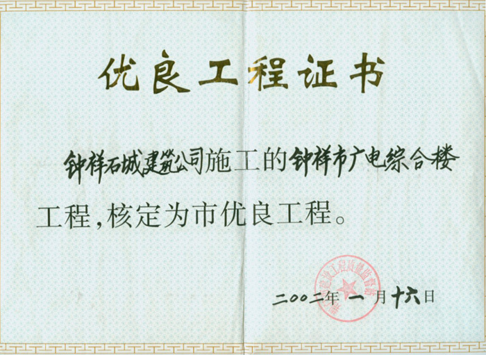 2001年1月施工的鐘祥市光電綜合樓核定為優(yōu)良工程
