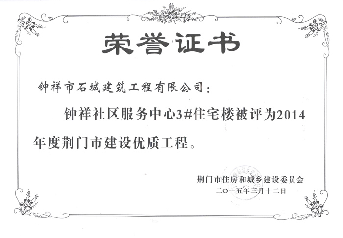 2015年3月12日被評(píng)為2014年度荊門(mén)市建設(shè)優(yōu)質(zhì)工程