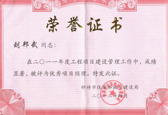 2012年4月劉邦武同志被評(píng)為優(yōu)秀項(xiàng)目經(jīng)理