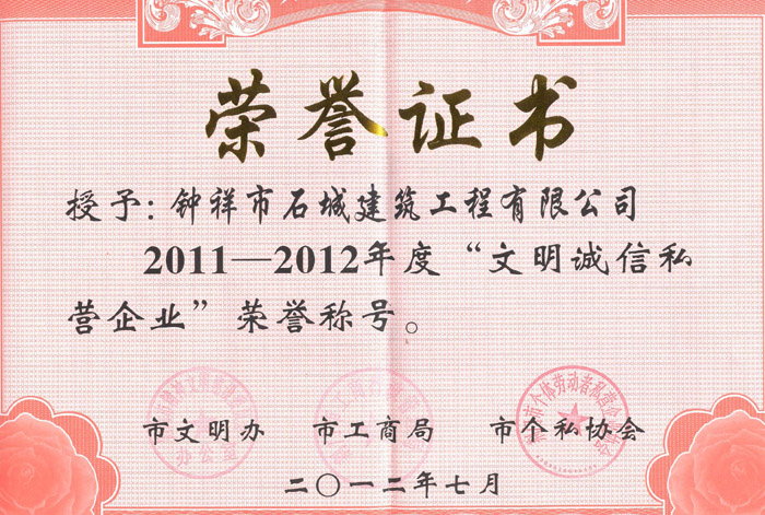 2012年7月榮獲2011-2012年度“文明誠(chéng)信私營(yíng)企業(yè)”榮譽(yù)稱號(hào)