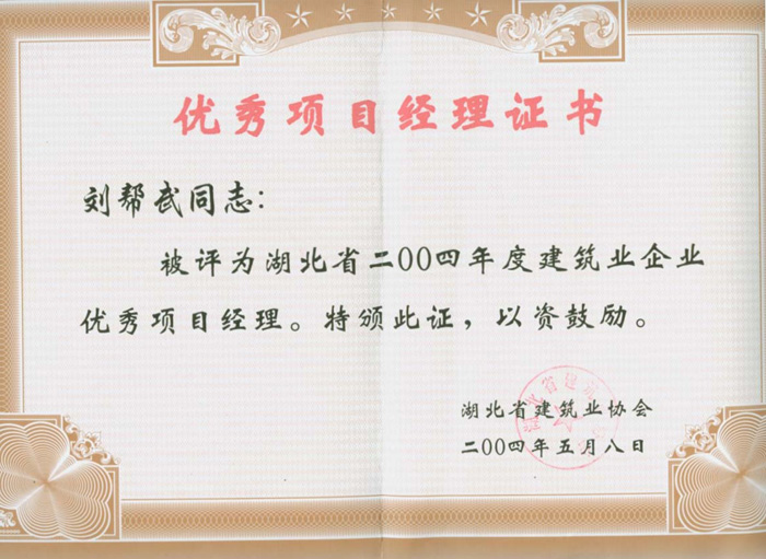 2004年5月劉幫武同志被評(píng)為湖北省2004年度建筑業(yè)企業(yè)優(yōu)秀項(xiàng)目經(jīng)理