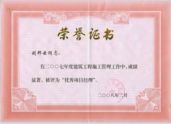 2008年2月劉幫云同志在2007年度被評(píng)為“優(yōu)秀項(xiàng)目經(jīng)理”