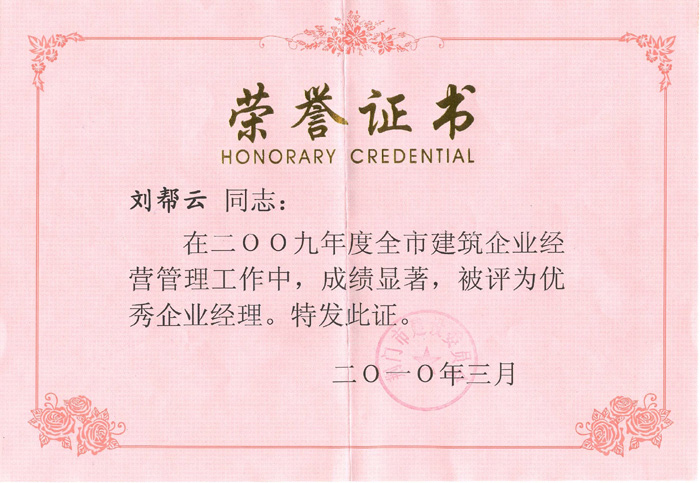 2010年3月劉幫云在2009年度被評(píng)為優(yōu)秀企業(yè)經(jīng)理