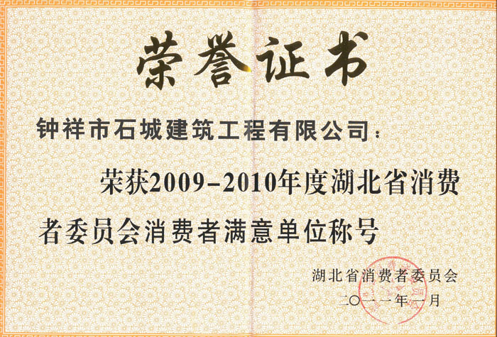 2011年1月榮獲2009-2010年度湖北省消費(fèi)委員會(huì)消費(fèi)者滿意單位稱號(hào)