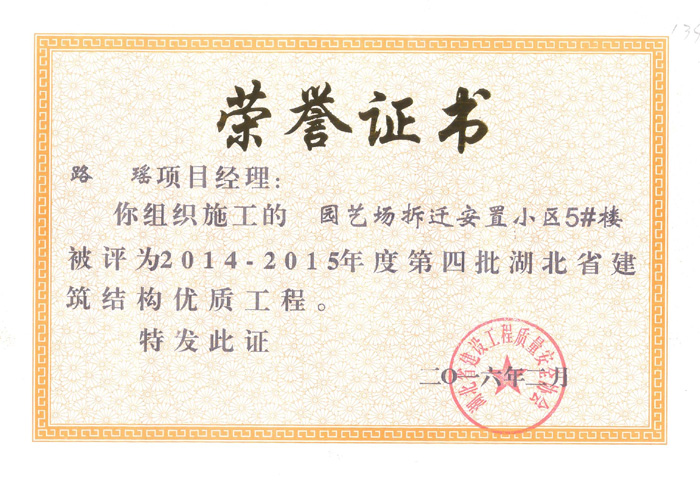 2016你那2月路遙項目經(jīng)理被評為2014-2015年度第四批湖北省建筑結(jié)構(gòu)優(yōu)質(zhì)工程